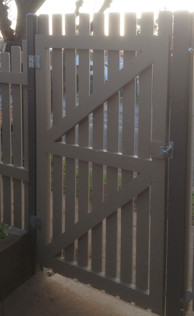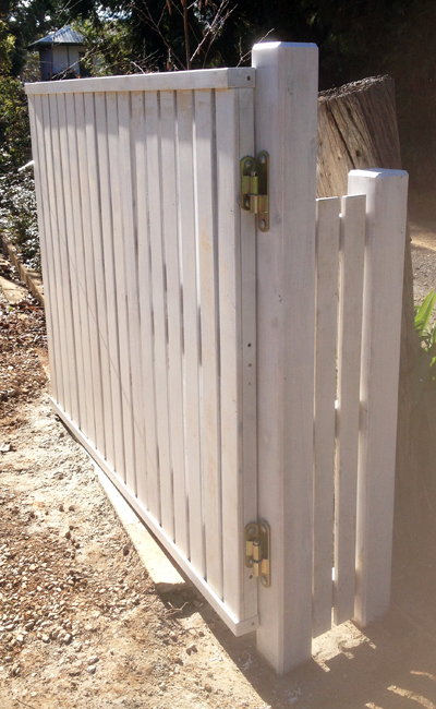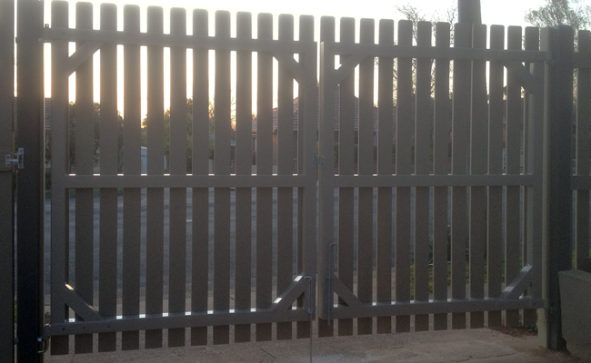 Our Timberwood picket gates come in two options; a pedestrian size single up to 1200mm wide opening (Cypress timber or RHS powder coated steel frame) or a drive through size double which can be up to 4200mm opening size and is only offered with an RHS powder coated steel frame. Height is usually 900mm (3 foot) or 1200mm (4 foot).